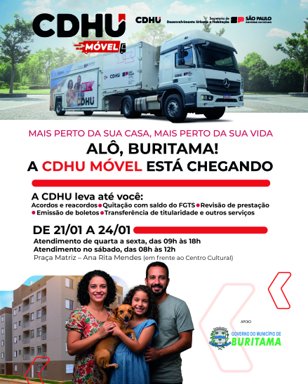 Em parceria com a Prefeitura de Buritama, a Companhia de Desenvolvimento Habitacional e Urbano (CDHU) traz ao município o serviço CDHU Móvel, uma unidade itinerante que oferecerá atendimento direto aos mutuários da região entre os dias 21 e 24 de janeiro.